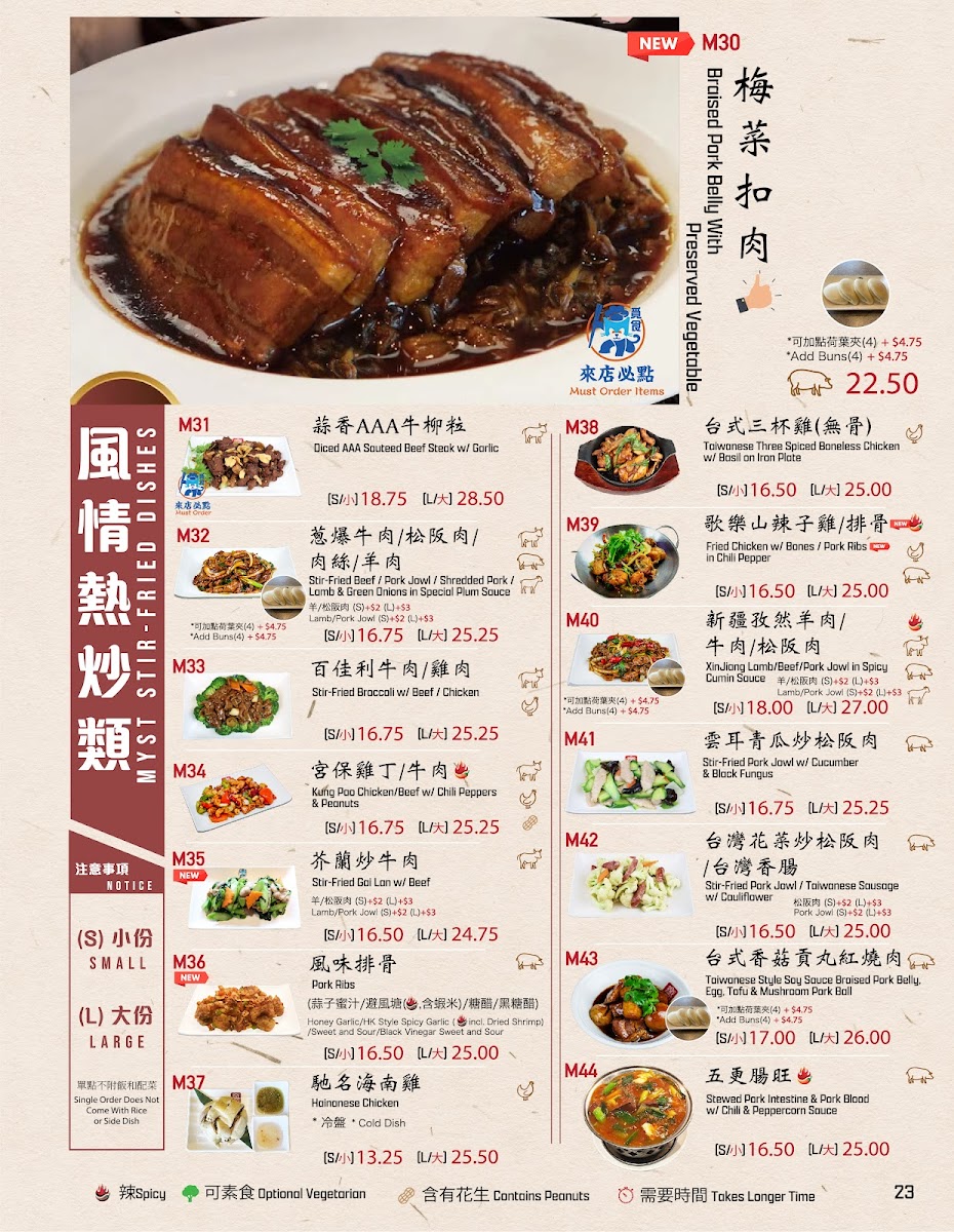 The menu at MYST Asian Fusion in Burnaby features a diverse selection of Taiwanese and Asian fusion dishes organized into distinct categories for ease of ordering. Guests can explore a variety of dim sum items, including steamed pork soup dumplings, shrimp and pork wontons in spicy chili sauce, and both steamed and deep-fried mini buns. Traditional light bites such as Chinese green onion pancakes and beef wraps are also available.